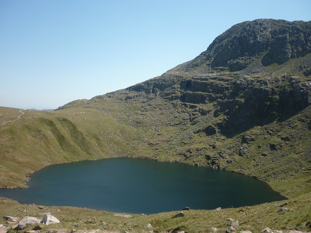 Angle Tarn looking East with Bow Fell on the right and the path I took to Rossett Gill on the left.