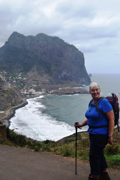 Gina descends to Porto da Cruz withPenha de Aguia, or Eagles Rock in the background.