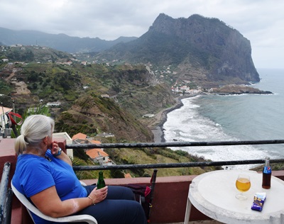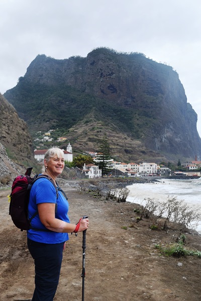 Gina descends to Porto da Cruz withPenha de Aguia, or Eagles Rock in the background.