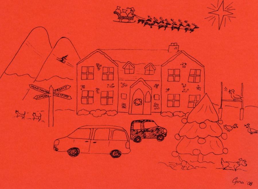 | Christmas 2008 2008, the signpost shows the Children in 4 different places. George is away for the ski season and misses Christmas. |